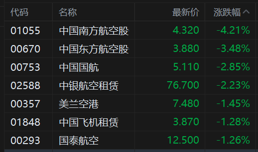 南方航空跌4.2%,中国东方航空跌3.5%,中国国航跌近3%,三者再度刷新阶段新低,