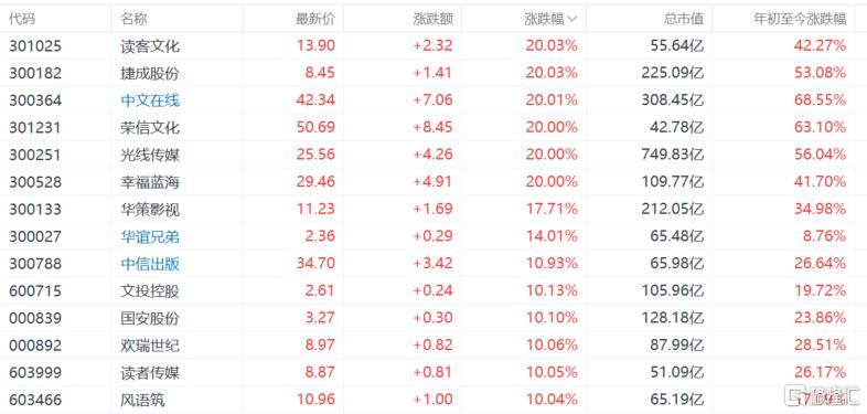 截至收盘,A股捷成股份中文在线幸福蓝海光线传媒等多股涨停,长江通信涨超7%,云天励飞-U博睿数据涨超6%,万兴科技因赛集团涨超5%。