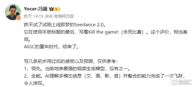 游戏科学CEO冯骥也直言,庆幸Seedance是中国的AI,它是一个“杀死比赛”的存在。