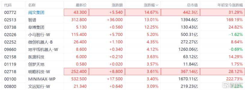 港股阅文集团涨超14%,智谱涨超13%,阜博集团涨超12%,小马智行涨超5%,MINIMAX-WP涨超3%