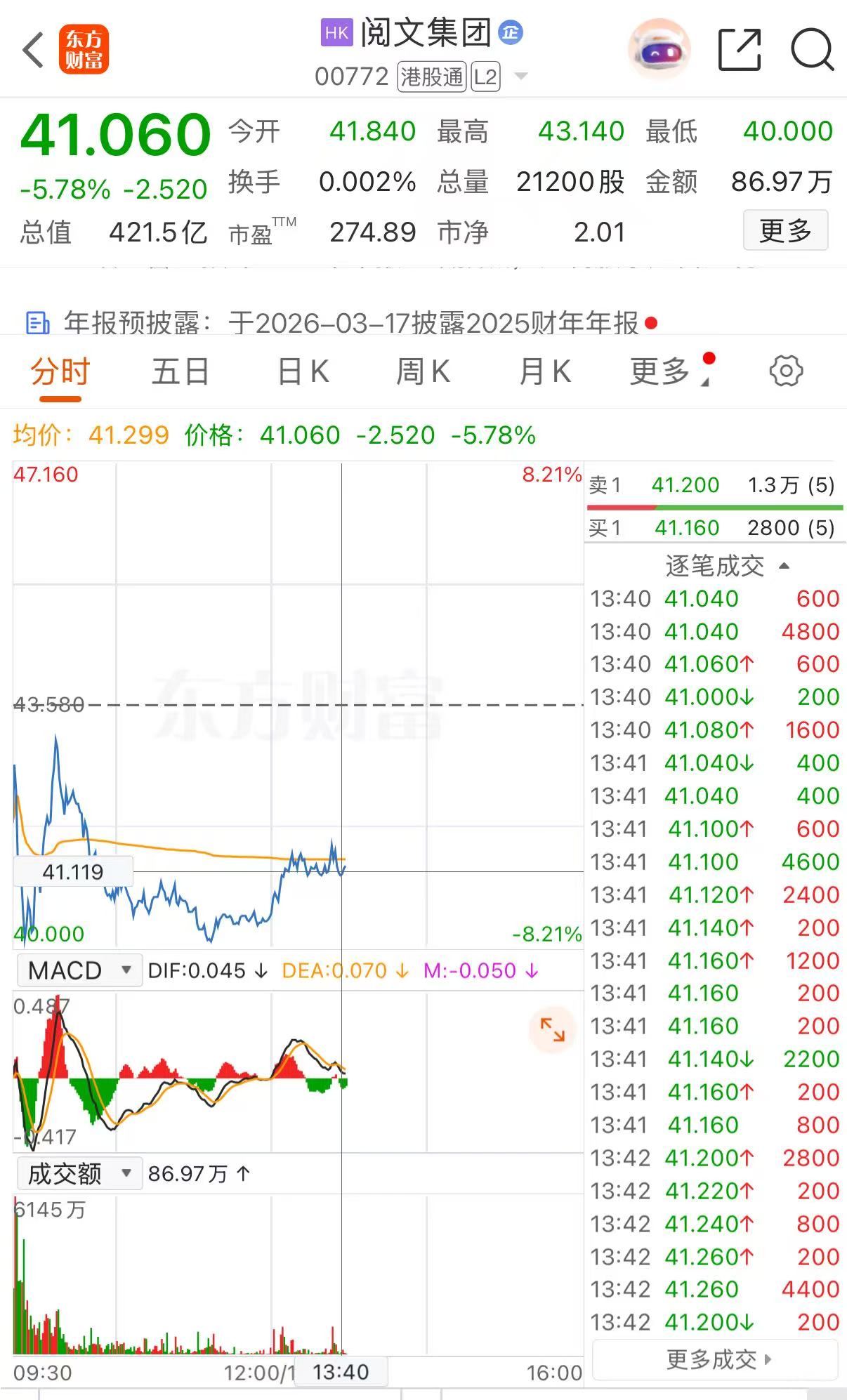 上证报中国证券网讯2月11日,阅文集团一度跌超8%,最低报40港元/股。截至13时40分,阅文集团报41.06港元/股,跌5.78%。