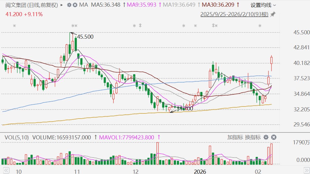阅文集团(0772.HK)盘中大涨近10%至41.5港元,为连续第二日放量上涨,股价创2025年11月5日以来新高。消息面上,首席执行官兼总裁侯晓楠发布春节内部信,明确将“长青内容、IP+AI、全球化”作为今年三大核心战略方向。