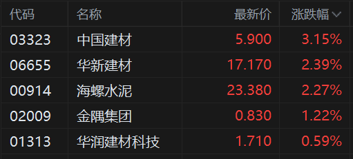 中国建材涨超3%,华新建材、海螺水泥涨超2%,金隅集团、