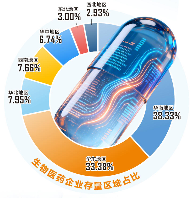 目前国内现有生物医药企业4.57万家,近七成深耕行业五年以上,技术积累与经营根基扎实。产业呈现高度集聚特征,华南地区、华东地区企业合计占比超七成,依托粤港澳大湾区、长三角优势,成为承接国家战略的核心阵地。