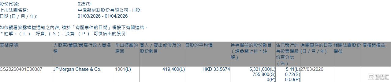 格隆汇4月1日丨根据联交所最新权益披露资料显示,2026年3月27日,中伟新材(02579.HK)获JPMorgan Chase & Co.以每股均价33.5674港元增持好仓41.94万股,涉资约1407.8万港元。