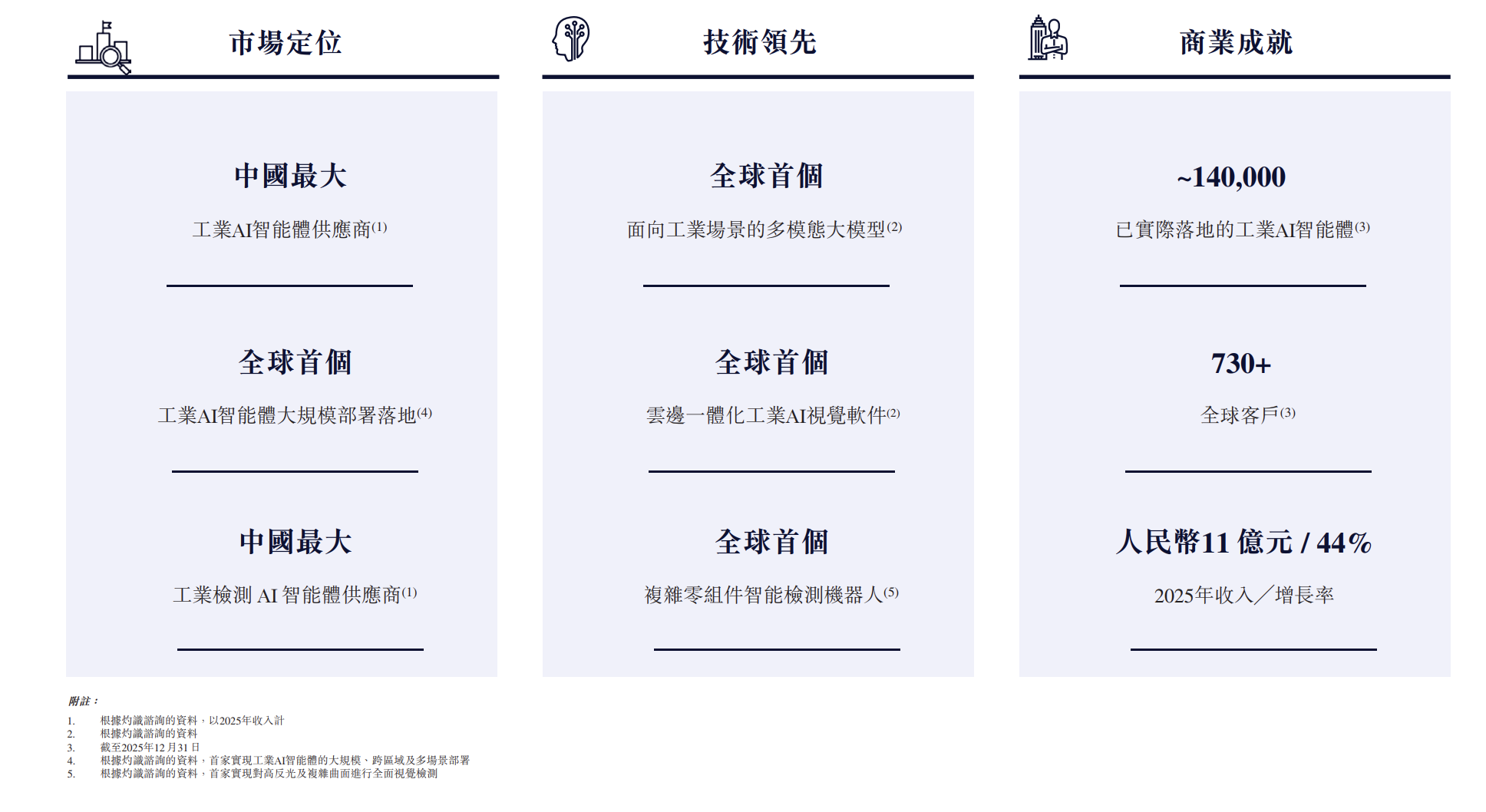 据招股书引用的灼识咨询资料,公司是2025年中国收入规模最大的工业AI智能体提供商,也是首家实现工业AI智能体大规模、跨区域、多场景部署的企业。截至2025年12月31日,思谋科技已累计向多个行业垂直领域,包括消费电子、新能源、精密制造、轨道交通及其他行业交付约140000个尖端工业AI智能体。