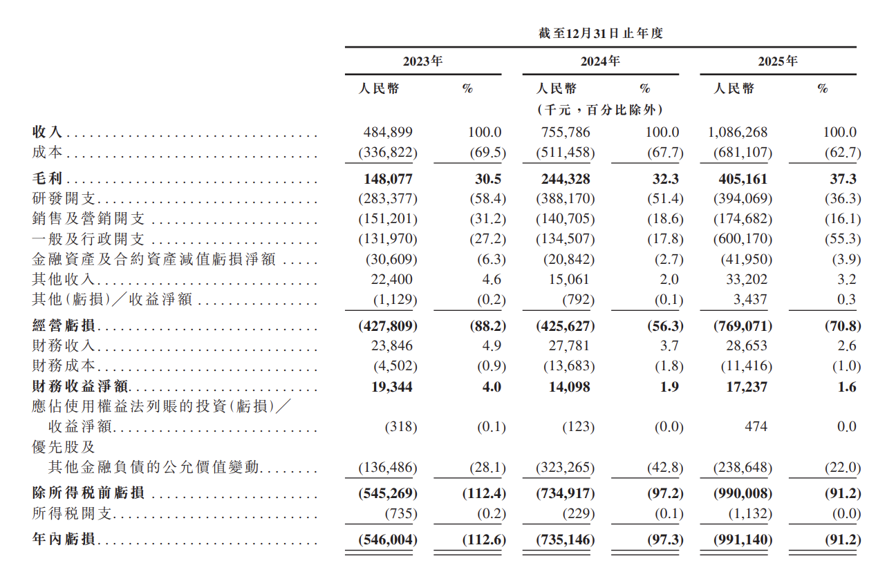 2023年至2025年,思谋科技的营业收入分别为4.85亿元、7.56亿元、10.86亿元,经调整净亏损分别为3.94亿元、3.79亿元、2.72亿元。期内,工业AI智能体产生的收入分别占公司总收入的62.4%、73.8%及78.5%。