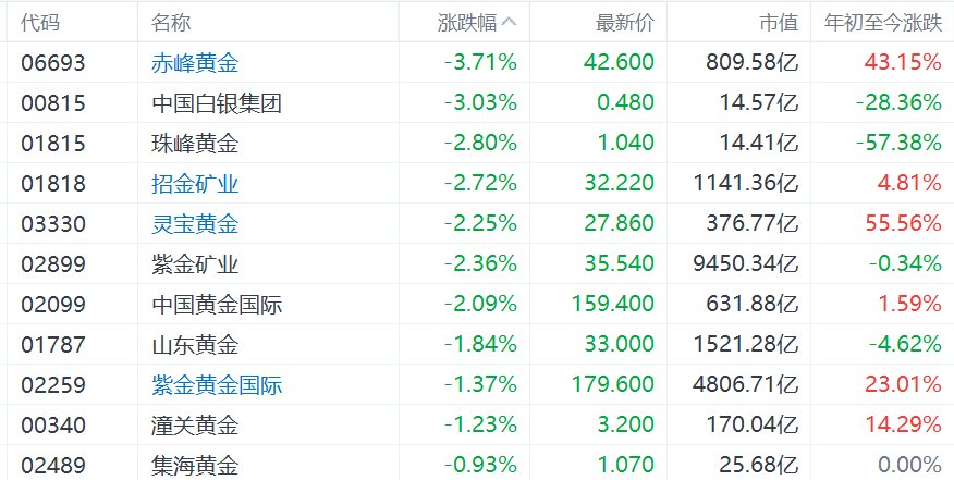 港股异动丨金价跳水拖累黄金股普跌,赤峰黄金跌超3%