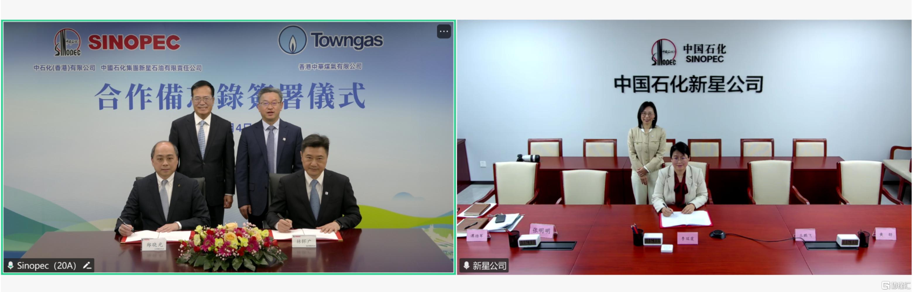 煤气公司联同中石化香港及新星公司连线同步签署合作备忘录,三方将在氢能、绿色甲醇及可持续航空燃料(SAF)等清洁能源领域展开深入合作,切实配合国家「双碳」政策方向,推动香港能源转型。