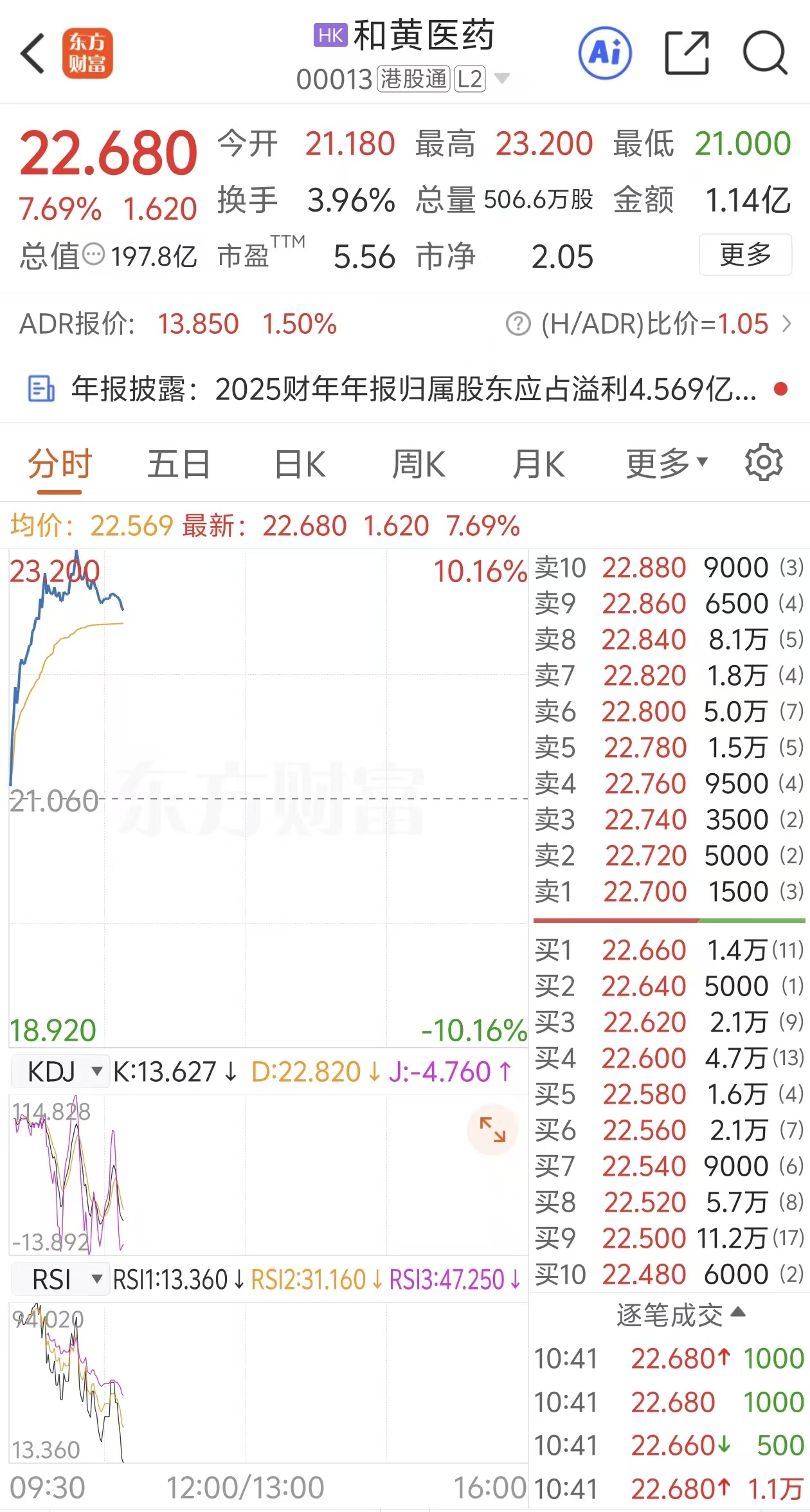 上证报中国证券网讯3月6日,和黄医药高开高走,一度涨超10%。截至10时41分,该股报22.68港元/股,涨幅收窄至7.69%。