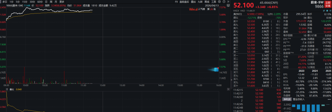 恒生科技指数盘中跌幅亦超过1%。恒生科技指数成份股中,蔚来-SW领涨,盘中涨幅超过7%。