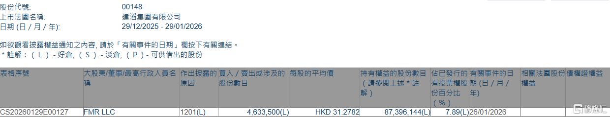 格隆汇1月29日丨根据联交所最新权益披露资料显示,2026年1月26日,建滔集团(00148.HK)遭FMR LLC在场内以每股均价31.2782港元减持463.35万股,涉资约1.45亿港元。