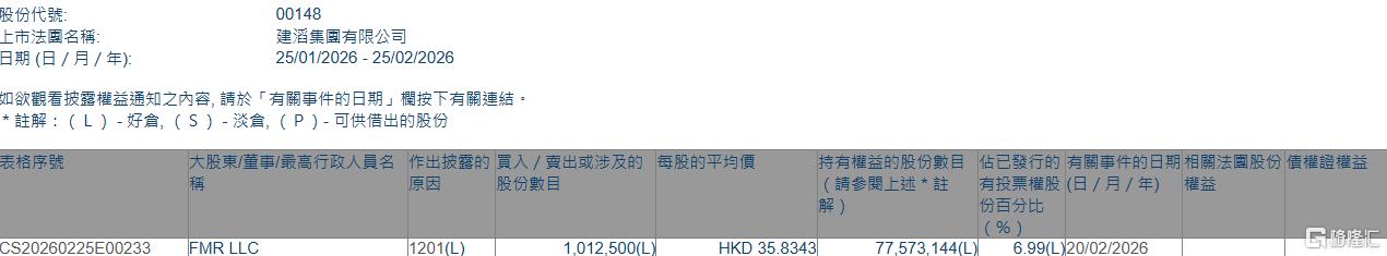 格隆汇2月25日丨根据联交所最新权益披露资料显示,2026年2月20日,建滔集团(00148.HK)遭FMR LLC在场内以每股均价35.8343港元减持101.25万股,涉资约3628.22万港元。