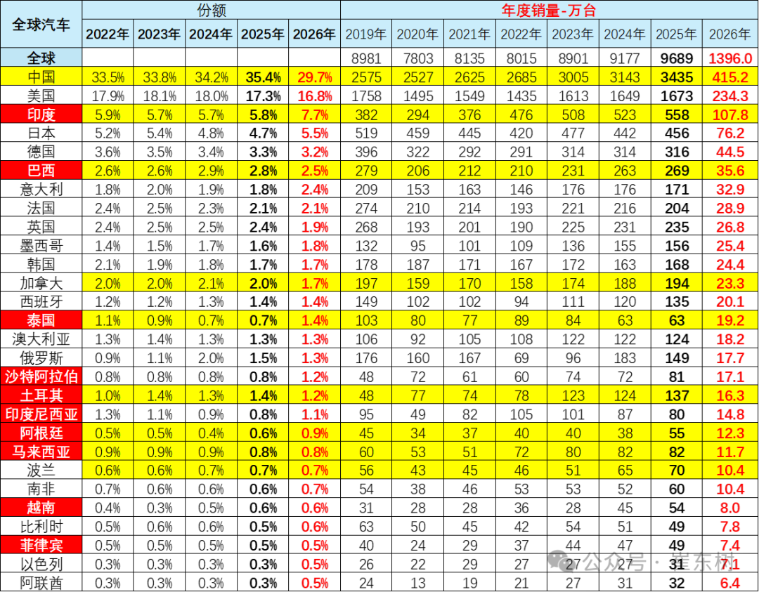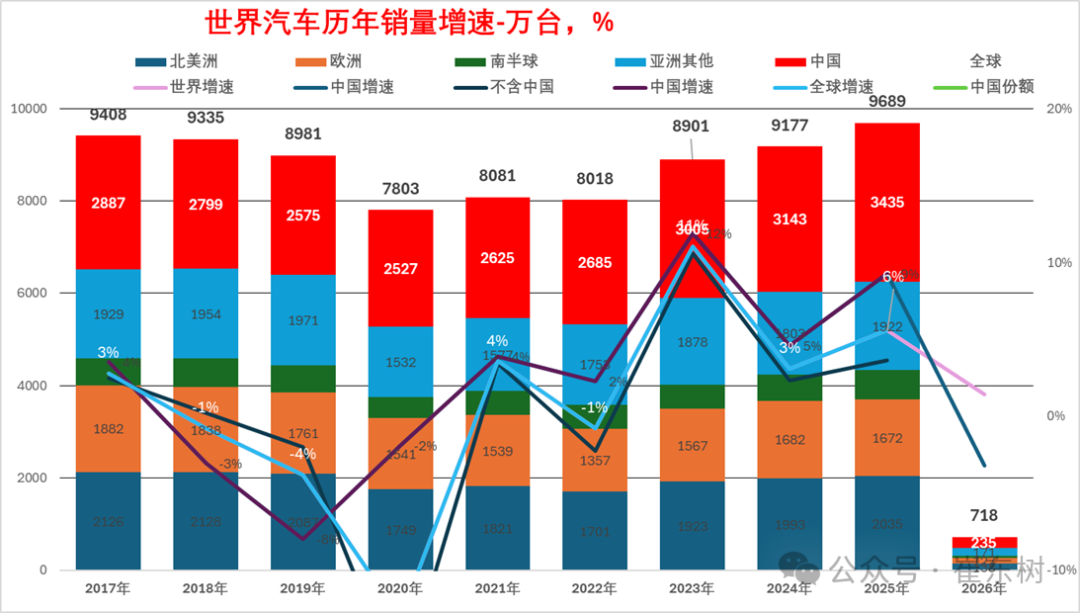 2026年的全球汽车销量增长0.1%,其中中国汽车销量415万台下降9%,美国销量下降2%。