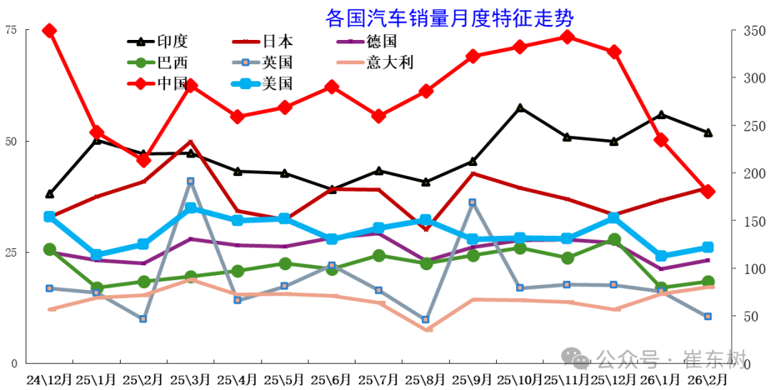 2025年以来世界车市增长总体较好,各月均好于同期水平。2026年世界车市波动较大,因2026年中国春节在2月,中国春节前车市销量平稳导致世界1月增长较好,但2月因春节因素导致中国车市销量剧烈下滑。