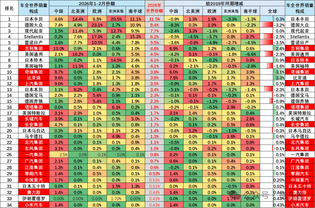 2026年欧洲车企普遍较弱,尤其雷诺日产、stellantis 大众的表现相对较弱,份额较2019年下降3个点左右,也就是损失近300万台中国市场压力大。大众集团的全球其它市场总体改善较大,南半球市场回升较明显。