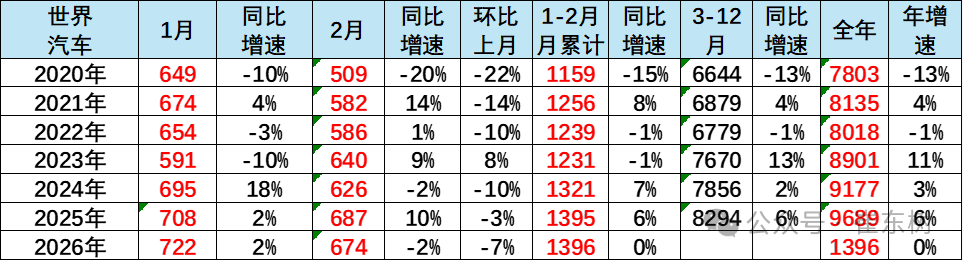 2025年全球汽车销量9689万台,同比增长6%。2026年2月的世界汽车销量达到674万台,同比下降2%.。2026年1-2月世界汽车销量达到1396万台,同比增0.1%。随着中国车市的相对放缓,2026年1-2月世界车市销量增长放缓。