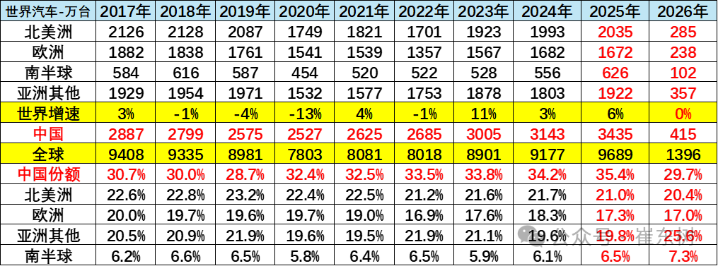 2025年世界市场进一步分化,2025年中国车市逐步恢复常态,加之出口逐步恢复,中国份额持续回升。