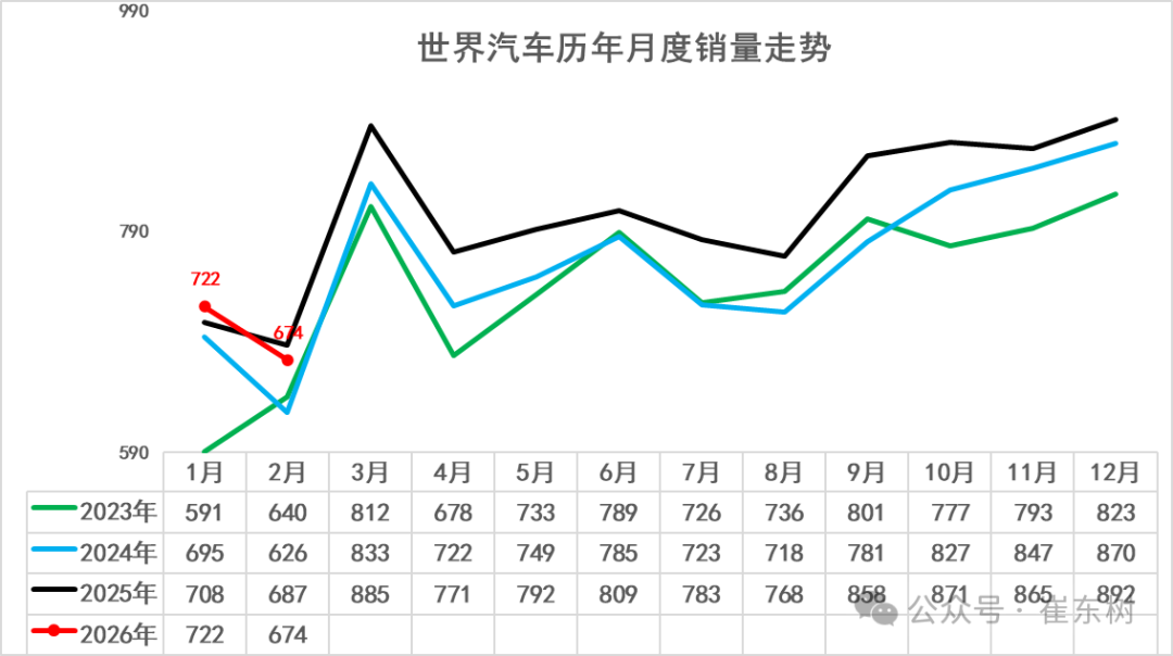 智通财经APP获悉,乘联分会秘书长崔东树发文称,2025年全球汽车销量9689万台,同比增长6%。2026年2月的世界汽车销量达到674万台,同比下降2%。2026年1-2月世界汽车销量达到1396万台,同比增0.1%。由于中国车市的增速低于预期,2026年1-2月世界车市销量增长放缓明显。中国车市近几年走势总体较好,份额持续提升,2020年以来中国的世界份额持续提升,到2023年达到33.8%,2024年中国车市达到34.2%,2025年中国车市达到世界35.4%,2026年中国车市达到世界29.7%,较2025年下滑较大。