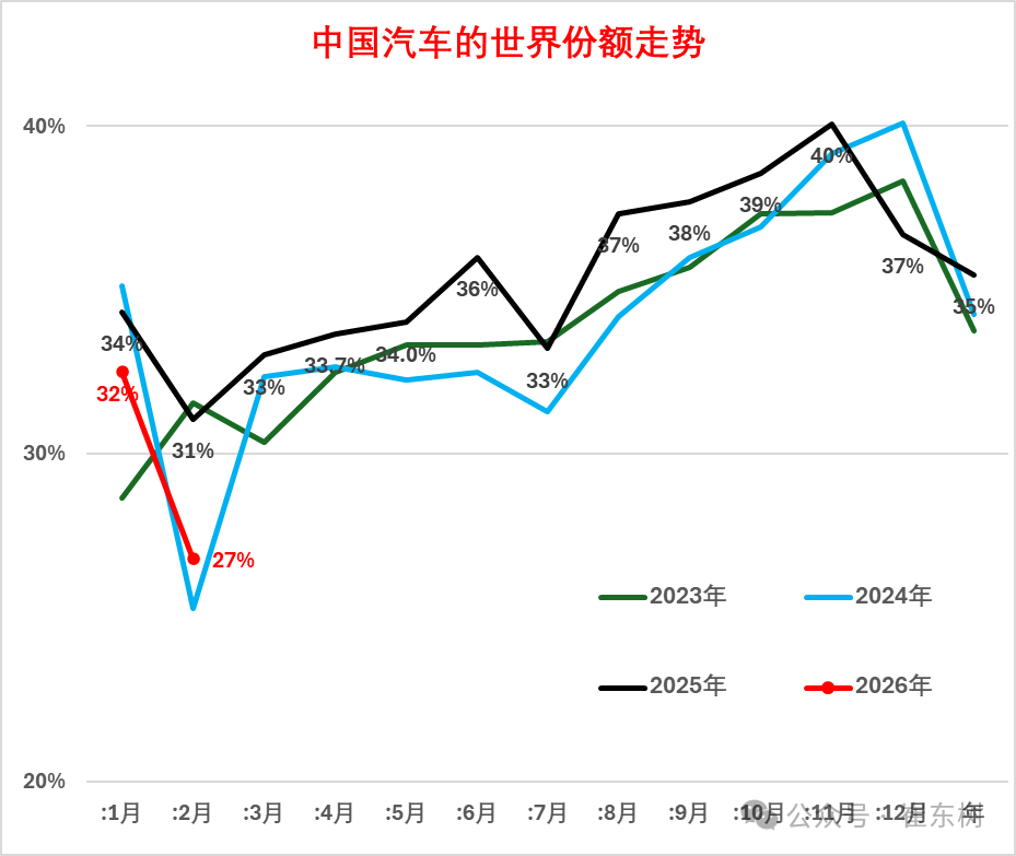 2026年初,随着两新补贴政策逐步启动的进度平缓,导致中国汽车销量下滑较大,2月份额下降到27%。