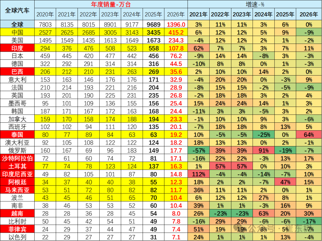 2026年1-2月的全球汽车销量增长0.1%,其中中国汽车销量下降9%,印度汽车市场销量增11%,泰国汽车市场增64%,俄罗斯市场销量降7%,而南美的部分市场表现较好。