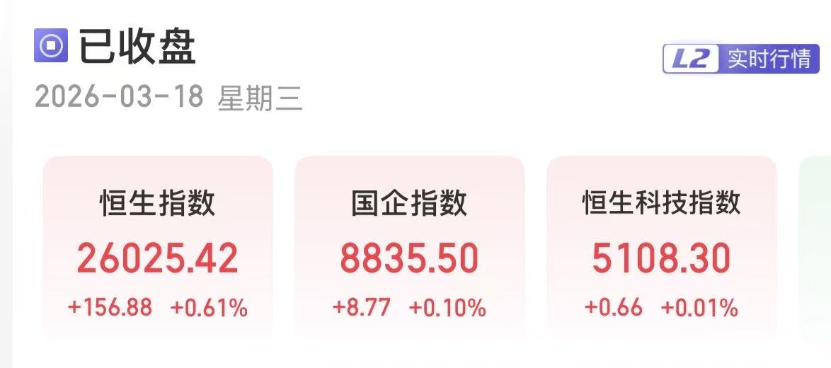 上证报中国证券网讯3月18日,港股三大指数午后走强,集体收红。截至收盘,恒生指数涨0.61%,报26025.42点;恒生国企指数涨0.1%,报8835.50点;恒生科技指数涨0.01%,报5108.30点。