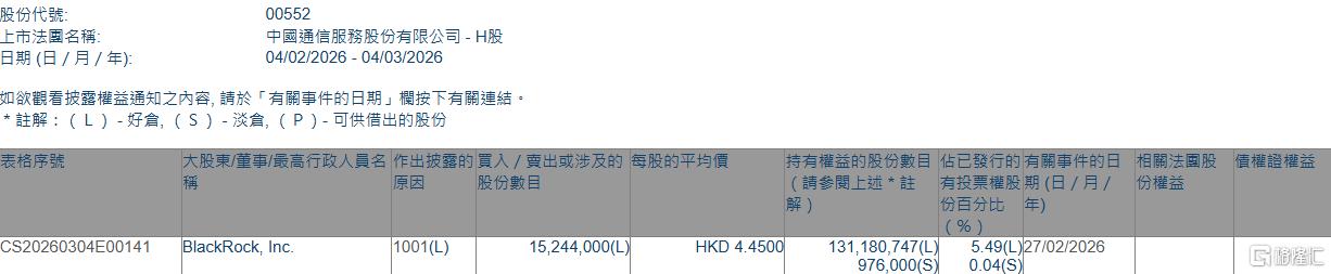 格隆汇3月4日丨根据联交所最新权益披露资料显示,2026年2月27日,中国通信服务(00552.HK)获BlackRock, Inc.在场内以每股均价4.45港元增持好仓1524.4万股,涉资约6783.58万港元。