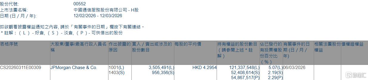 格隆汇3月12日丨根据联交所最新权益披露资料显示,2026年3月6日,中国通信服务(00552.HK)获JPMorgan Chase & Co.以每股均价4.2954港元增持好仓350.55万股,涉资约1505.75万港元。
