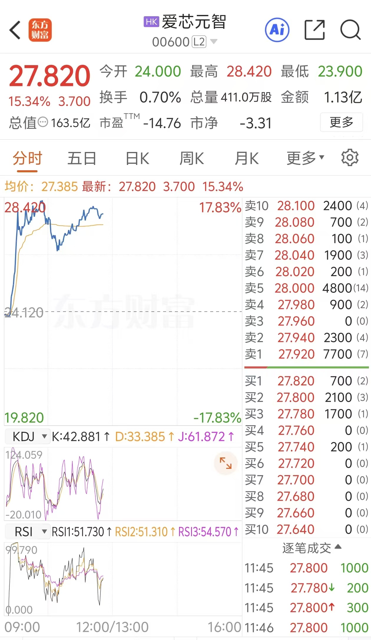 上证报中国证券网讯2月13日早盘,爱芯元智盘中一度涨超17%,最高触及28.42港元/股。截至11时46分,爱芯元智报27.82港元/股,涨15.34%。同日,港股半导体股走强,天数智芯盘中涨超11%,兆易创新H股盘中涨近4%。