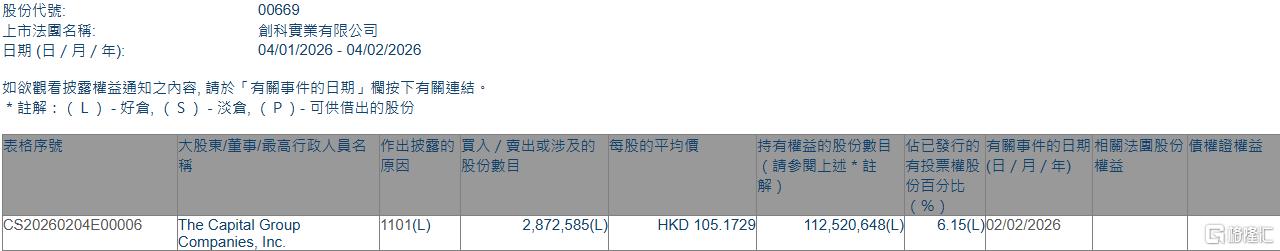 格隆汇2月4日丨根据联交所最新权益披露资料显示,2026年2月2日,创科实业(00669.HK)获The Capital Group Companies, Inc.在场内以每股均价105.1729港元增持287.26万股,涉资约3.02亿港元。