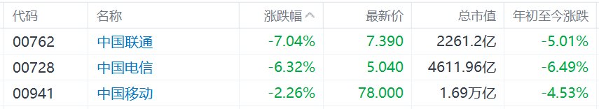 港股异动丨电信服务增值税被上调,三大中资电信股集体下挫