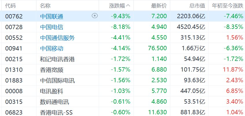 港股三大中资电信股重挫,中国联通跌超9%,中国电信跌超8%
