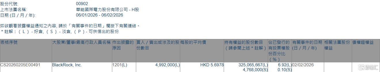 格隆汇2月6日丨根据联交所最新权益披露资料显示,2026年2月2日,华能国际电力股份(00902.HK)遭BlackRock, Inc.在场内以每股均价5.6978港元减持499.2万股,涉资约2844.34万港元。
