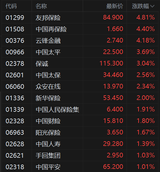 众安在线涨超2%,中国人民保险、