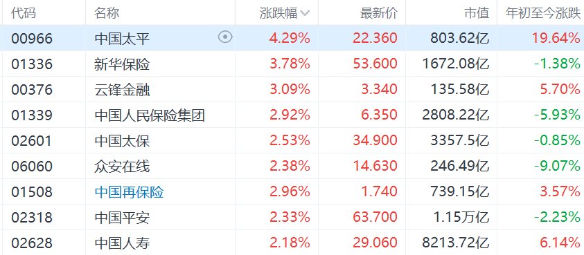 港股保险股集体走强,中国太平涨超4%