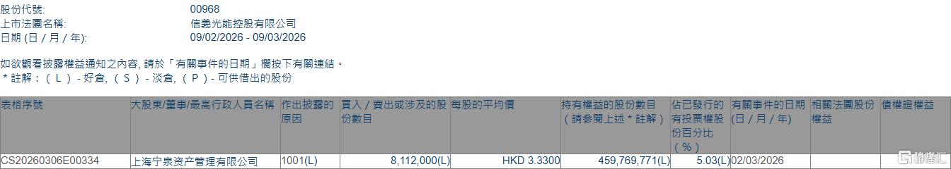 格隆汇3月9日丨根据联交所最新权益披露资料显示,2026年3月2日,信义光能(00968.HK)获上海宁泉资产管理有限公司在场内以每股均价3.33港元增持811.2万股,涉资约2701.3万港元。