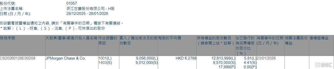 格隆汇1月28日丨根据联交所最新权益披露资料显示,2026年1月23日,浙江世宝(01057.HK)获JPMorgan Chase & Co.以每股均价6.2768港元增持好仓905.6万股,涉资约5684.27万港元。