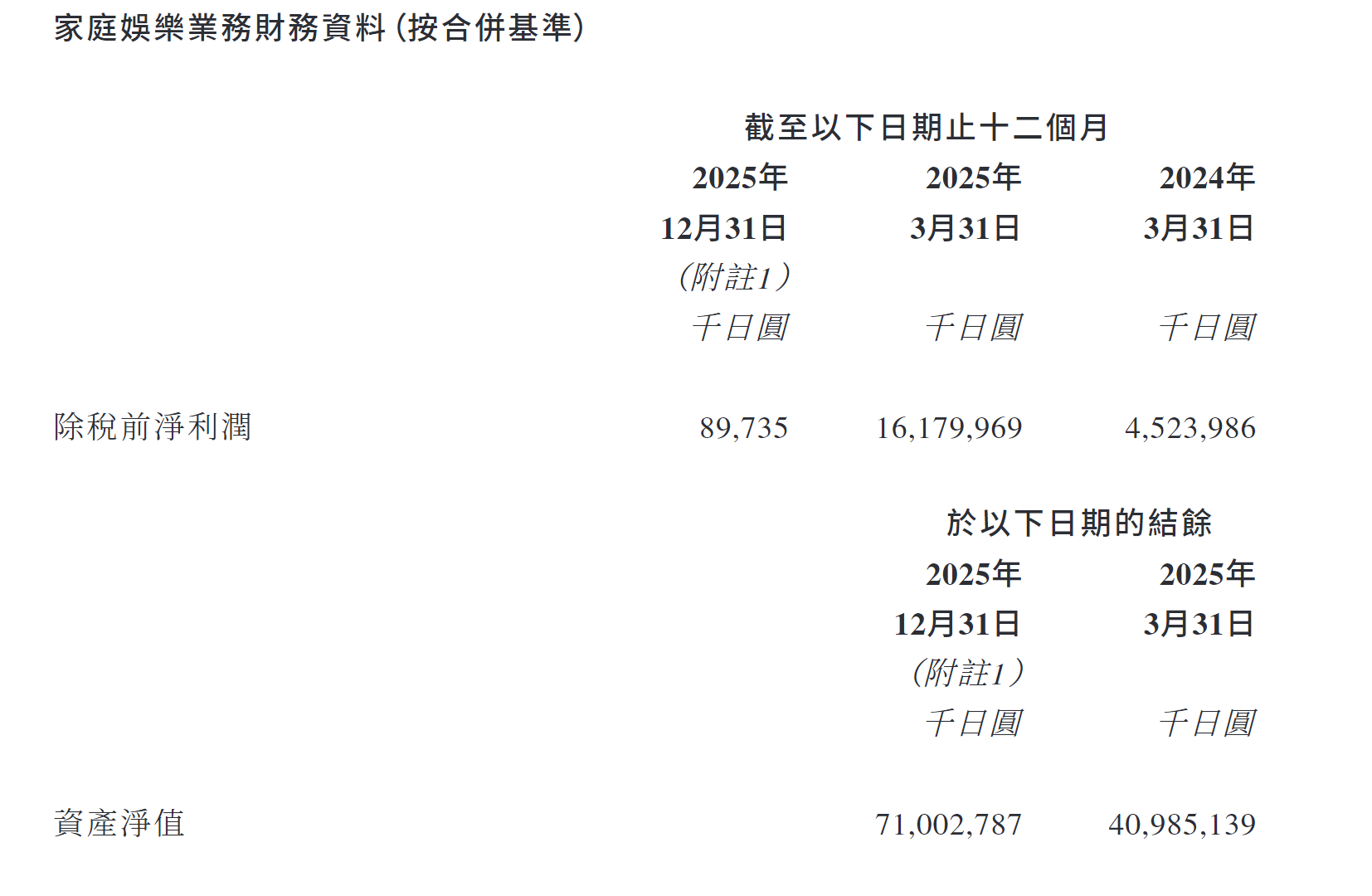 公告显示,2025年,索尼的家庭娱乐业务除税前净利润约为8973.5万日元,资产净值约为710亿日元。