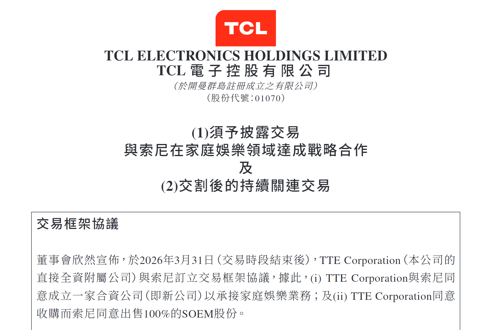 上证报中国证券网讯3月31日,TCL电子与索尼宣布,双方已就家庭娱乐领域的战略合作签署具有法律约束力的最终协议。此举是继2026年1月20日宣布的战略合作意向备忘录之后的新进展。