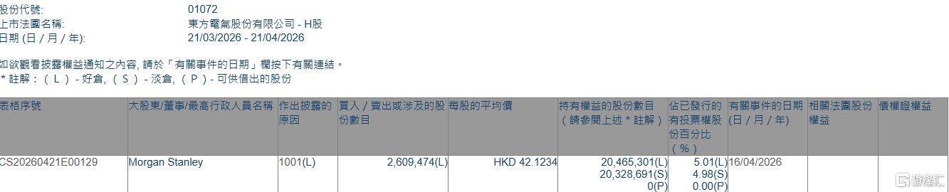 格隆汇4月21日丨根据联交所最新权益披露资料显示,2026年4月16日,东方电气(01072.HK)获Morgan Stanley在场内以每股均价42.1234港元增持好仓260.95万股,涉资约1.1亿港元。