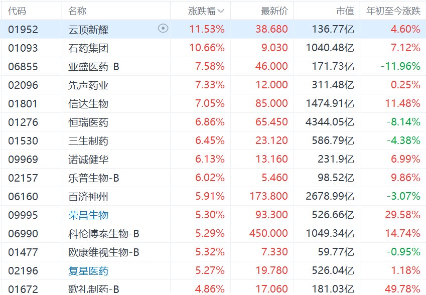 港股创新药股涨幅进一步扩大,石药集团涨超10%