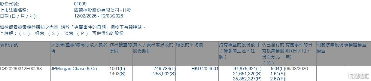 格隆汇3月12日丨根据联交所最新权益披露资料显示,2026年3月9日,国药控股(01099.HK)获JPMorgan Chase & Co.以每股均价20.4501港元增持好仓74.98万股,涉资约1533.32万港元。