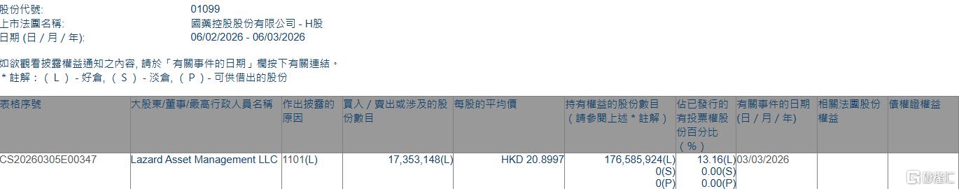 格隆汇3月6日丨根据联交所最新权益披露资料显示,2026年3月3日,国药控股(01099.HK)获Lazard Asset Management LLC在场内以每股均价20.8997港元增持1735.31万股,涉资约3.63亿港元。