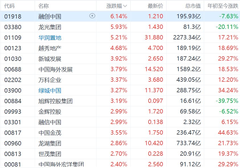 港股市场内房股集体上涨,其中,融创中国涨超6%,龙光集团、华润置地涨超5%,越秀地产涨超4%,新城发展、中国海外发展、万科企业、绿城中国、旭辉控股集团、中国金茂涨超3%。