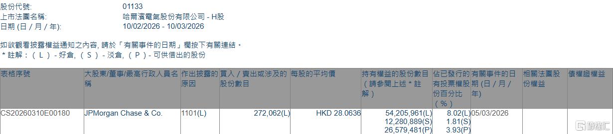 格隆汇3月10日丨根据联交所最新权益披露资料显示,2026年3月5日,哈尔滨电气(01133.HK)获JPMorgan Chase & Co.以每股均价28.0636港元增持好仓27.21万股,涉资约763.5万港元。