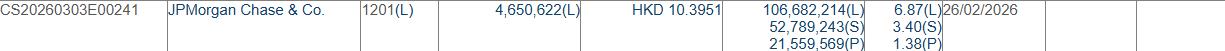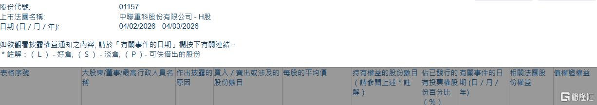 格隆汇3月4日丨根据联交所最新权益披露资料显示,2026年2月26日,中联重科(01157.HK)遭JPMorgan Chase & Co.以每股均价10.3951港元减持好仓465.06万股,涉资约4834.37万港元。