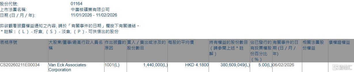 格隆汇2月11日丨根据联交所最新权益披露资料显示,2026年2月6日,中广核矿业(01164.HK)获Van Eck Associates Corporation在场内以每股均价4.18港元增持144万股,涉资约601.92万港元。