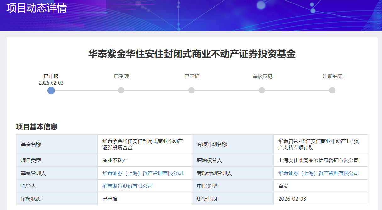 上证报中国证券网讯2月3日,深交所披露信息显示,华泰紫金华住安住封闭式商业不动产证券投资基金正式提交申报,这也是首单申报至深交所的商业不动产REITs。