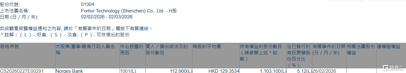 格隆汇3月2日丨根据联交所最新权益披露资料显示,2026年2月26日,FORTIOR(01304.HK)获Norges Bank在场内以每股均价129.3534港元增持11.29万股,涉资约1460.4万港元。