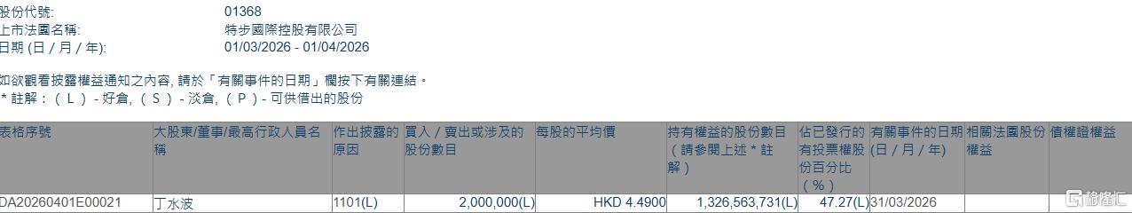 格隆汇4月1日丨根据联交所最新权益披露资料显示,2026年3月31日,特步国际(01368.HK)获执行董事兼主席丁水波在场内以每股均价4.49港元增持200万股,涉资约898万港元。